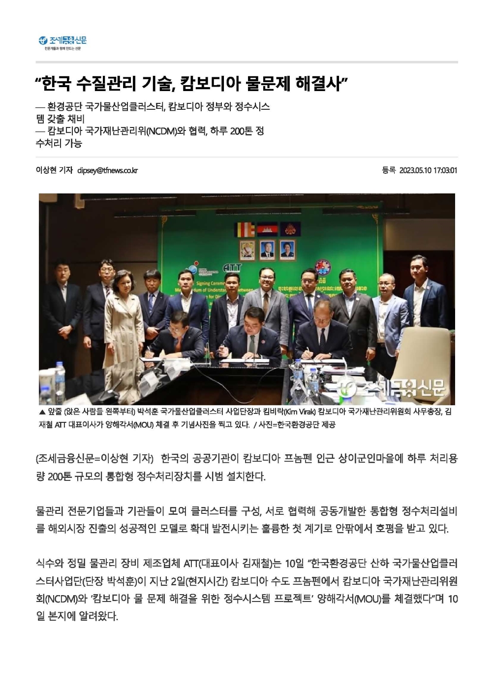 įº¸µð¾Æ ±¹°¡Àç³°ü¸®À§¿øÈ¸(NCDM)-Çѱ¹È¯°æ°ø´Ü ±¹°¡¹°»ê¾÷Ŭ·¯½ºÅÍ-¿¡ÀÌÆ¼Æ¼¢ß°¡ 2023³â 5¿ù 2ÀÏ Ä¯º¸µð¾Æ ÇÁ³ðÆæ¿¡¼ įº¸µð¾Æ ¹° ¹®Á¦ ÇØ°áÀ» À§ÇÑ Á¤¼ö½Ã½ºÅÛ ÇÁ·ÎÁ§Æ® MOU¸¦ ü°áÇÏ¿´½À´Ï´Ù.󸮿뷮 200Åæ/ÀÏ ±Ô¸ðÀÇ ÅëÇÕÇü Á¤¼öó¸®ÀåÄ¡·Î ÇÁ³ðÆæ Àα٠»óÀ̱ºÀθ¶À»¿¡ ½Ã¹ü ¼³Ä¡ ¿¹Á¤À̸ç, À̹ø ½Ã¹ü »ç¾÷À» ¼º°øÀûÀ¸·Î ¼öÇàÇÏ¿© įº¸µð¾Æ Àü¿ªÀ¸·Î È®´ë º¸±Þ µÉ ¼ö ÀÖµµ·Ï ÃÖ¼±À» ´ÙÇϰڽÀ´Ï´Ù.